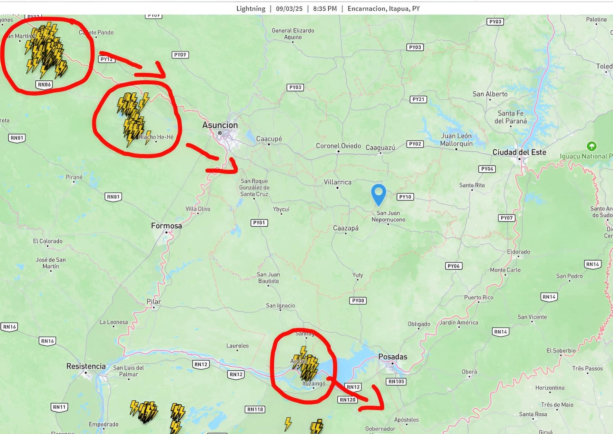 Las tormentas perdieron intensidad al sur, ahora sólo se observa un núcleo intenso sobre Ayolas, esto no significa que ya pasó todo ya que se podrían formar nuevas tormentas en las próximas horas.