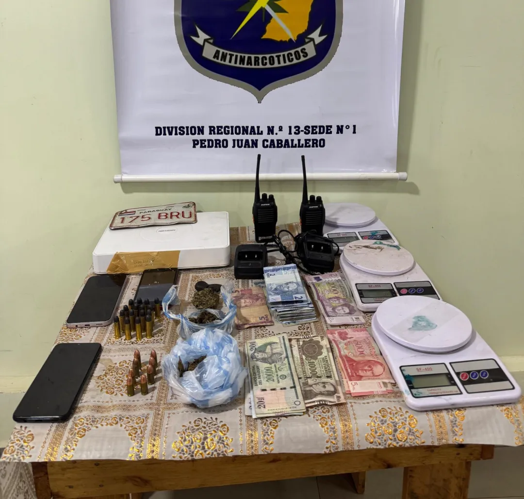Entre las evidencias incautadas se detallan 9,9 gramos de marihuana tipo hachís, 21,3 gramos de marihuana prensada y 32,4 gramos de marihuana picada. Además de las sustancias estupefacientes, los agentes hallaron tres balanzas de precisión digital, lo que refuerza la sospecha de microtráfico. También se incautaron ocho cartuchos calibre 9 milímetros y 16 cartuchos calibre 38 milímetros sin percutir, dos radios walkie-talkie con sus cargadores, un aparato DVR, dinero en efectivo de baja denominación en reales y guaraníes, tres teléfonos celulares y documentos varios.