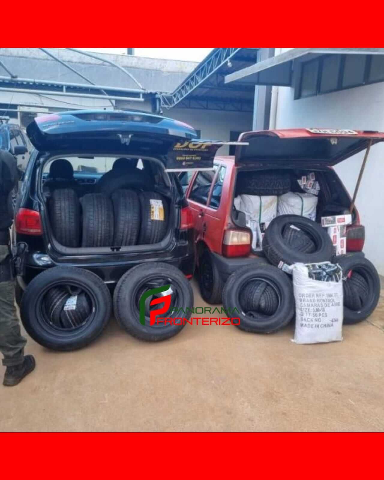 No primeiro veículo, condutor (51) e a passageira (36), transportavam 60 unidades de pneus. No segundo carro, a condutora (47) e passageiro (30), transportavam 16 pneus, os pacotes de cigarros, as prensas de roupas e o fardo com as câmaras de ar para motocicleta.