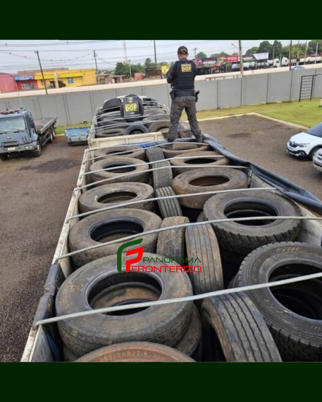 Policiais militares do DOF (Departamento de Operações de Fronteira) apreenderam na madrugada deste domingo (14) cerca de 36 pneus para caminhão e oito pneus para veículo de passeio, todos novos e sem a documentação legal para circulação no Brasil.