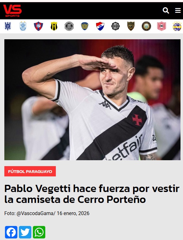 CERRO EN LA DULCE ESPERA: El delantero argentino, Pablo Vegetti, le tiene a Cerro Porteño en la dulce espera – «Vegetti informó formalmente a la directiva del Vasco Da Gama sobre la oferta que recibió de Cerro Porteño y su deseo de marcharse. Ahora, el Vasco Da Gama busca la mejor manera de acceder a la solicitud del jugador y, a cambio, obtener una ventaja económica del acuerdo», indicó @Danteskoo.