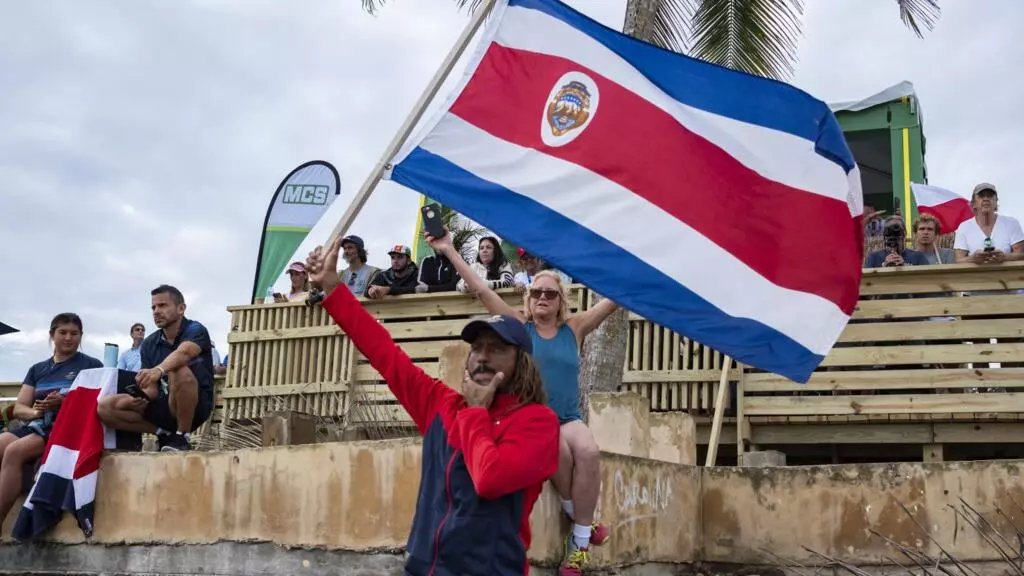 Un miembro del equipo de Costa Rica ondea la bandera de su país durante los Juegos Mundiales de Surf de la ISA, una prueba clasificatoria para los Juegos Olímpicos de París 2024, en la playa La Marginal de Arecibo, Puerto Rico,