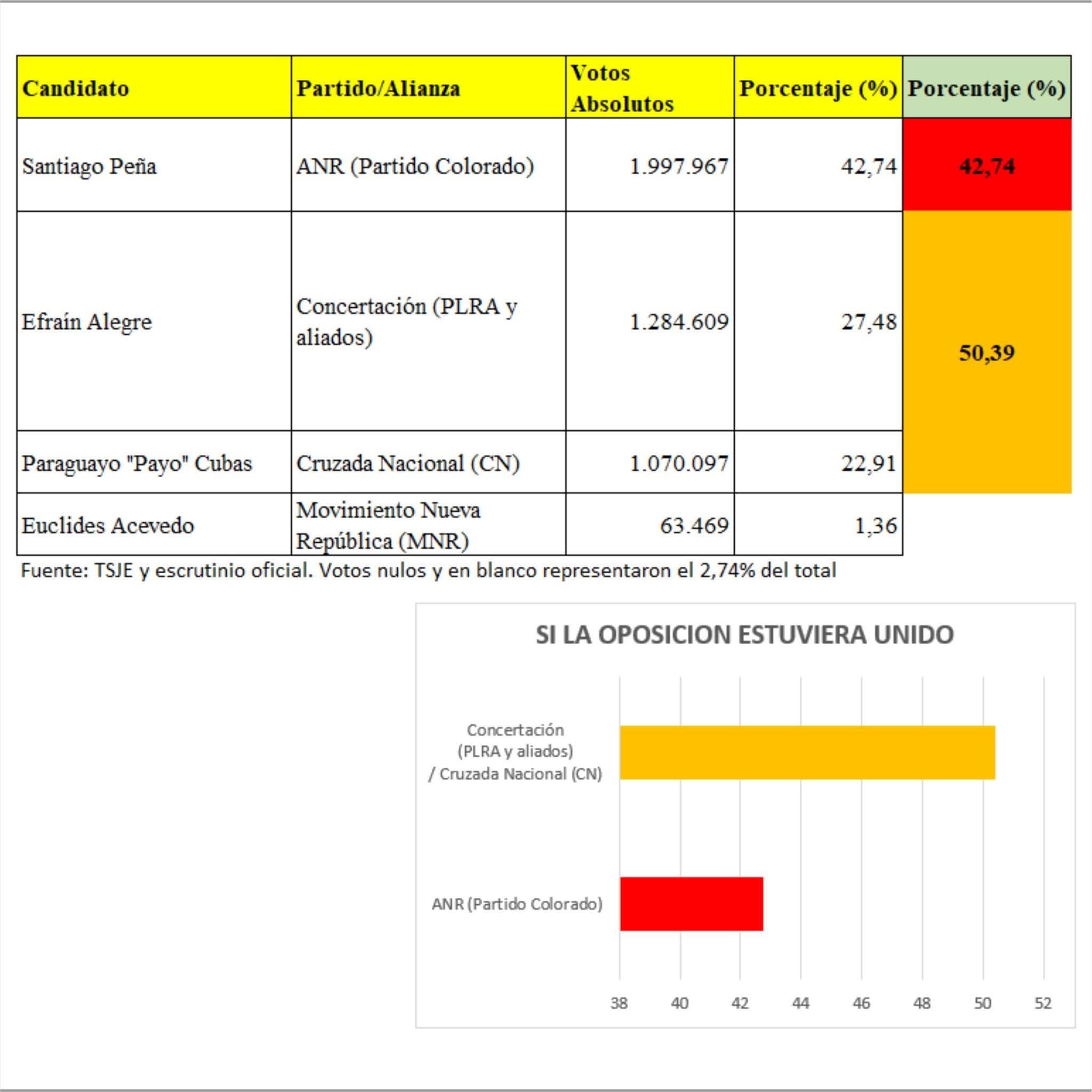 Aunque las negociaciones han sido intermitentes y marcadas por rupturas recientes, un análisis de los resultados de las elecciones de 2023 revela que una oposición unida –sumando, por ejemplo, los 1.284.609 votos de Efraín Alegre (27,48%) y los 1.070.097 de Payo Cubas (22,91%)– podría haber alcanzado hasta un 50,39% de los votos válidos, superando holgadamente el 42,74% obtenido por el oficialismo en la última contienda presidencial y potencialmente hasta un 32% en una proyección conservadora para 2028.