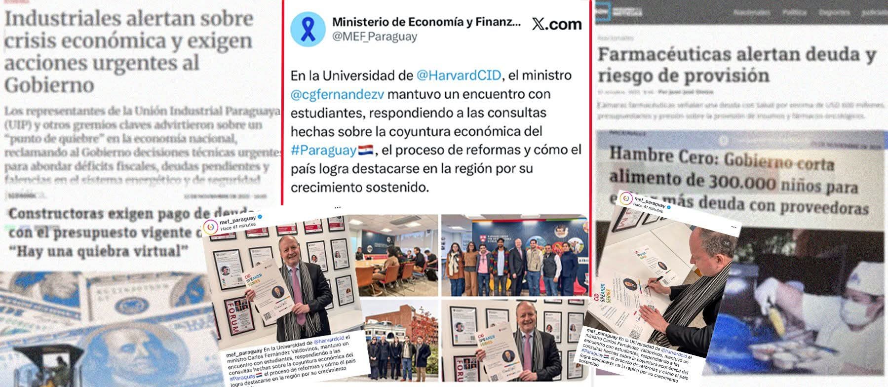 ◾️El Ministerio de Economía y Finanzas @MEF_Paraguay publicitó en sus redes sociales de que su titular, Carlos Fernández Valdovinos, está en Estados Unidos dando cátedras de “reformas económicas” a estudiantes de Harvard. Mientras tanto, en el país varias industrias están en crisis por la deuda del Gobierno con las mismas. Entre el rosario de reclamos están las deudas del Estado con empresas farmacéuticas (no hay medicamentos), con las constructoras (obras públicas casi paralizadas) y los proveedores de alimentos escolares, derivando en el corte de provisión de alimentos para 300 mil niños antes de finalizar clases.