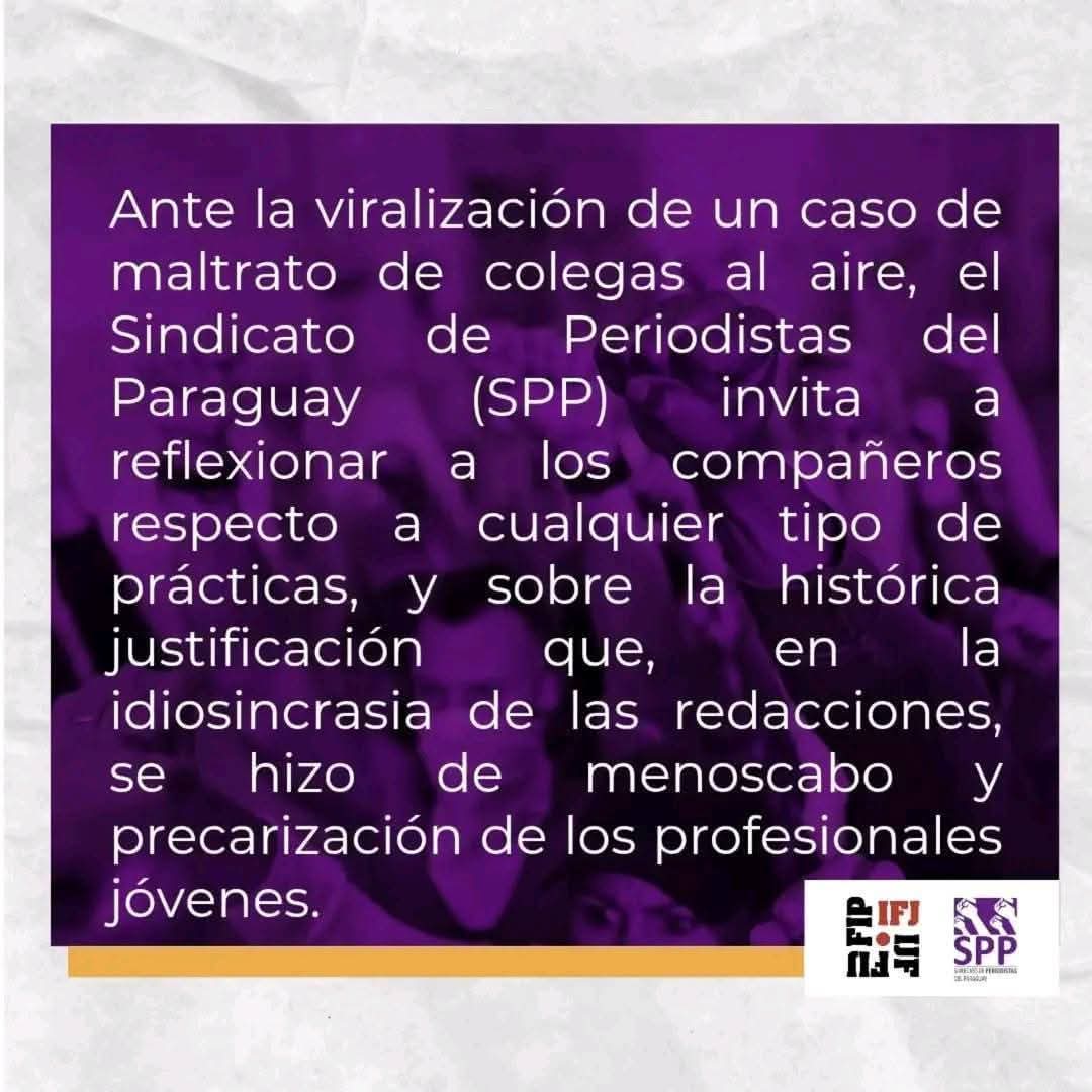El Sindicato de Periodistas del Paraguay (SPP) se pronunció enérgicamente tras la viralización de un caso de maltrato laboral a colegas al aire.