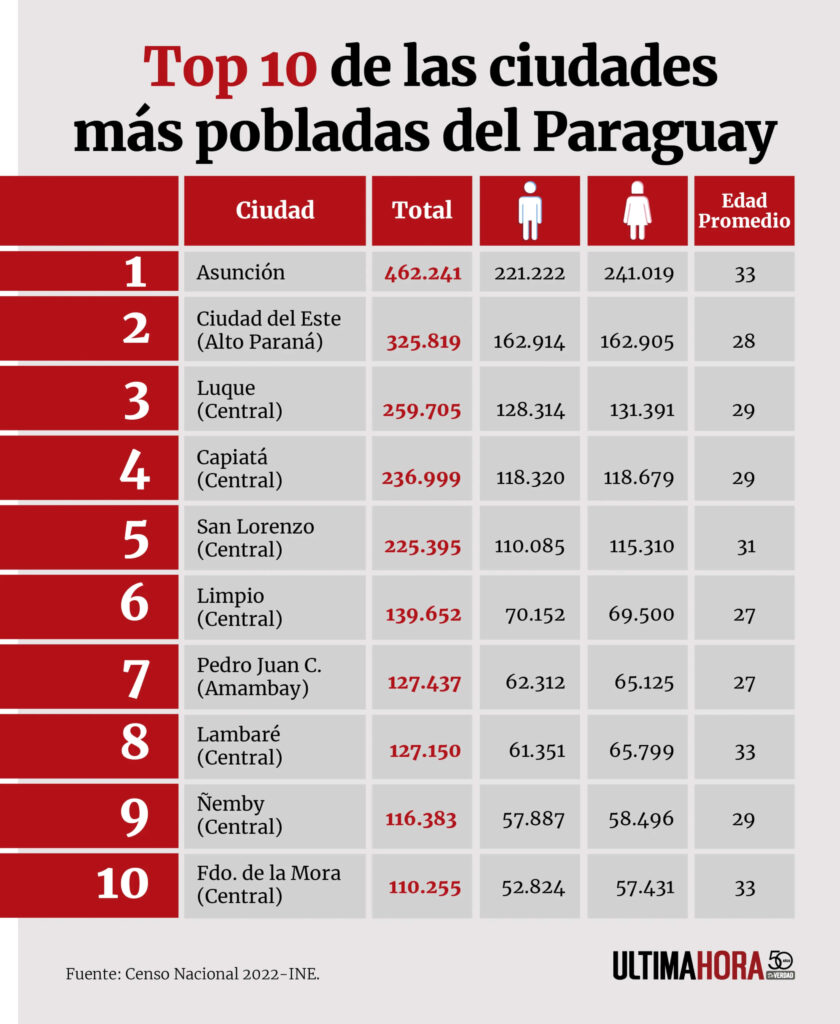 El Censo Nacional 2022, realizado por el INE, actualizó los indicadores demográficos por departamento y distrito, cuyos datos permiten determinar cuáles son las 10 ciudades más pobladas del Paraguay.