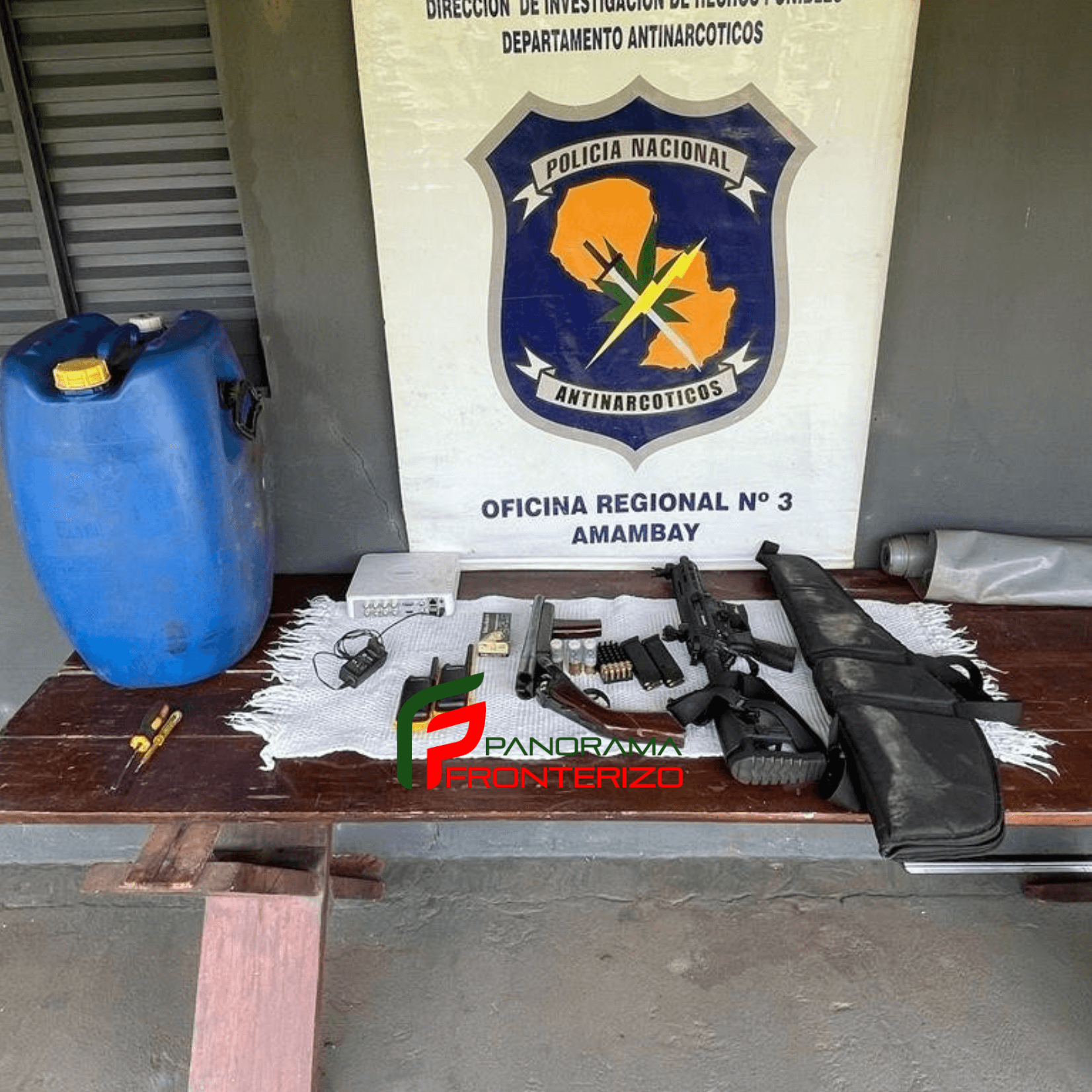 Al mismo tiempo fueron incautadas varias evidencias como un rifle de la marca Derva modelo BD610 del calibre 9 milímetros con dos cargadores y 20 cartuchos, una escopeta de doble caño de la marca Amadeo Rossi con culata de color marrón, dos radios walkie de la marca motorola, un binocular de la marca Tasco negro, un DVR de circuito cerrado de la marca Hikvisión, un bidón azul para 50 litros y cinta de embalaje rojo.