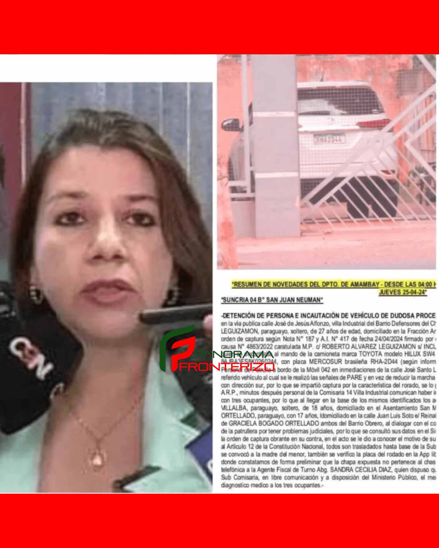 *RESUMEN DE NOVEDADES DEL DPTO. DE AMAMBAY – DESDE LAS 04:00 HS DEL MIERCOLES 24-04-24 A 04:00 HS DEL JUEVES 25-04-24* *SUNCRIA 04 B° SAN JUAN NEUMAN* -DETENCIÓN DE PERSONA E INCAUTACIÓN DE VEHÍCULO DE DUDOSA PROCEDENCIA, realizado hoy 25/04/2024 a las 01:10 horas en la vía publica calle José de Jesús Alfonzo, villa Industrial del Barrio Defensores del Chaco de esta ciudad, se trata de ROBERTO ALVAREZ LEGUIZAMON, paraguayo, soltero, de 27 años de edad, domiciliado en la Fracción Amistad II del Barrio Jardín Aurora de esta ciudad, con orden de captura según Nota N° 187 y A.I. N° 417 de fecha 24/04/2024 firmado por el Actuario Judicial EDGAR FRANCISCO LEON con causa N° 4863/2022 caratulada M.P. c/ ROBERTO ALVAREZ LEGUIZAMON s/ INCUMPLIMIENTO DEL DEBER LEGAL ALIMENTARIO, quien se encontraba al mando de la camioneta marca TOYOTA modelo HILUX SW4 (FORTUNER) 4×4 de color BLANCO con chasis N° 8AJBA3FS8K0260244, con placa MERCOSUR brasileña RHA-2D44 (según información preliminar correspondiente a otro vehículo).- Personal de Patrulla a bordo de la Móvil 042 en inmediaciones de la calle José Santo Lugo esq. Ursus V. Benítez del Barrio Obrero avisto el referido vehículo al cual se le realizó las señales de PARE y en vez de reducir la marcha esquivo la móvil patrullera huyendo precipitadamente con dirección sur, por lo que se impartió captura por la característica del rorado, se lo perdió de vista próximo al campo de Exposición de la A.R.P., minutos después personal de la Comisaria 14 Villa Industrial comunican haber interceptado una camioneta con similar características con tres ocupantes, por lo que al llegar en la base de los mismos identificados los acompañantes como 1- OSMAR RODRIGO ROLON VILLALBA, paraguayo, soltero, de 18 años, domiciliado en el Asentamiento San Miguel y el menor 2- ROLANDO JAVIER BOGADO ORTELLADO, paraguayo, con 17 años, ldomiciliado en la calle Juan Luis Soto e/ Reinaldo Avalos y Mykure de la Fracción Santa Teresa, hijo de GRACIELA BOGADO ORTELLADO ambos del Barrio Obrero, al dialogar con el conductor este refirió haber acelerado la marcha y huir de la patrullera por tener problemas judiciales, por lo que se consultó sus datos en el Sistema Informático de la Policial Nacional constatando la orden de captura obrante en su contra, en el acto se le dio a conocer el motivo de su detención y sus derechos Constitucionales conforme al Artículo 12 de la Constitución Nacional, todos son trasladados hasta base de la Sub Comisaria N° 4 del Barrio San Juan Neuman donde se convocó a la madre del menor, también se verifico la placa del rodado en la App libre denominada CONSULTA PLACA MULTA E FIPE donde constatamos de forma preliminar que la chapa expuesta no pertenece al chasis del rodado. El hecho fue comunicado vía llamada telefónica a la Agente Fiscal de Turno Abg. SANDRA CECILIA DIAZ, quien dispuso que el detenido junto a su rodado permanezca en esta Sub Comisaria, en libre comunicación y a disposición del Ministerio Público, el menor fue entregado a la madre bajo acta, se realizo diagnostico medico a los tres ocupantes.