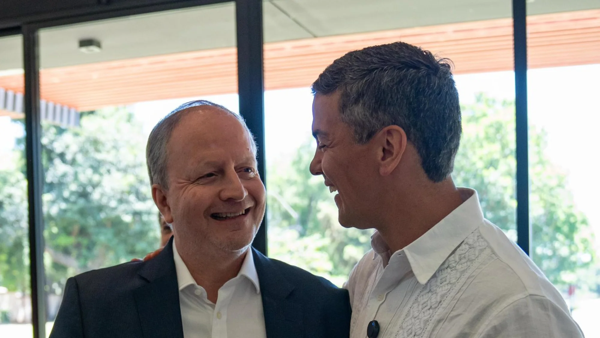 El ahora ex ministro Carlos Fernández Valdovinos (i) y junto el presidente Santiago Peña (d). Foto: x.com/SantiPenap.