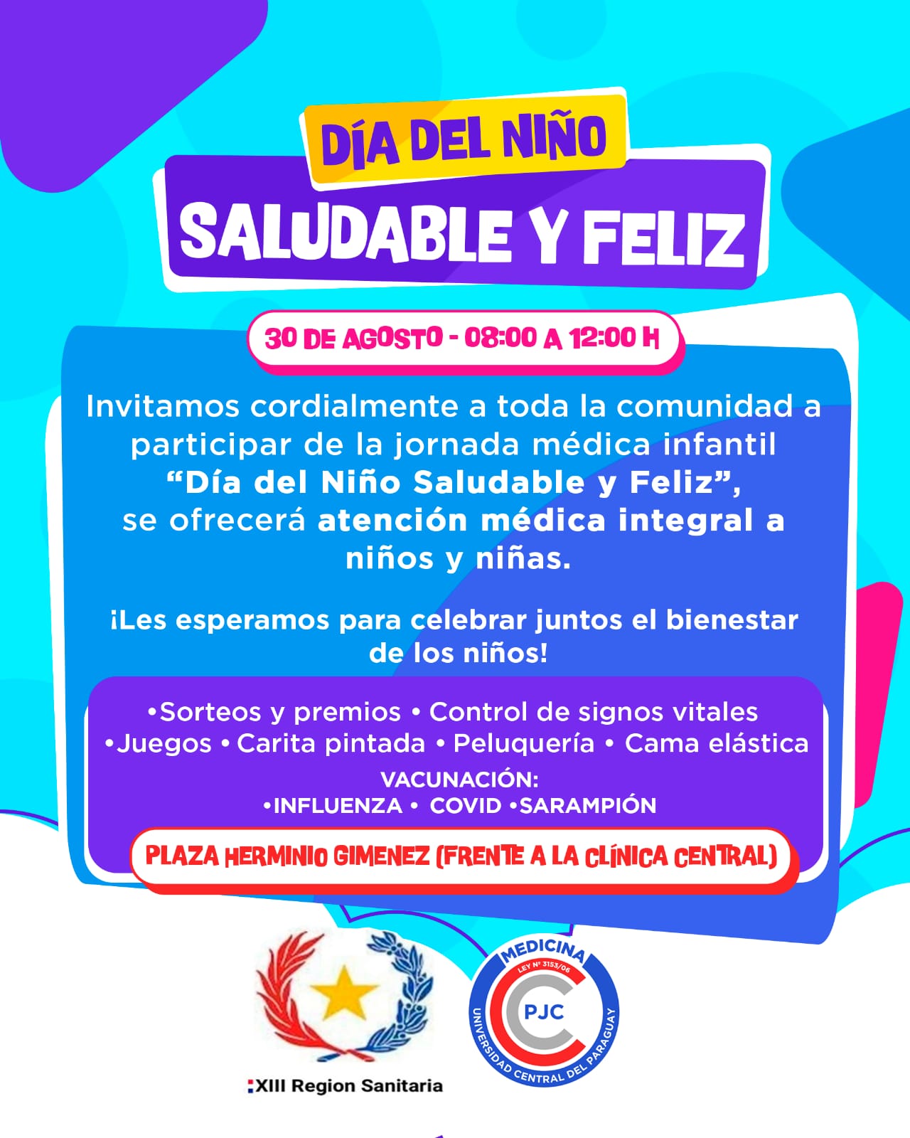 La UCP Universidad Central del Paraguay Filial Pedro Juan Caballero invita a la comunidad a participar de la jornada médica infantil por el dia del niño saludable y feliz. Se ofrecerá atención medica integral a niños y niñas de la comunidad.