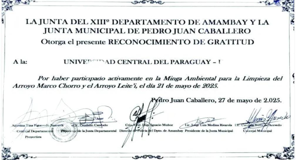 La Universidad Central del Paraguay (UCP) sede Pedro Juan Caballero recibió un reconocimiento por su destacada participación en la minga ambiental realizada en el cauce hídrico Marcos Chorro y el arroyo Leite-í. Este reconocimiento fue otorgado por la Junta Departamental de Amambay y la Junta Municipal de Pedro Juan Caballero.