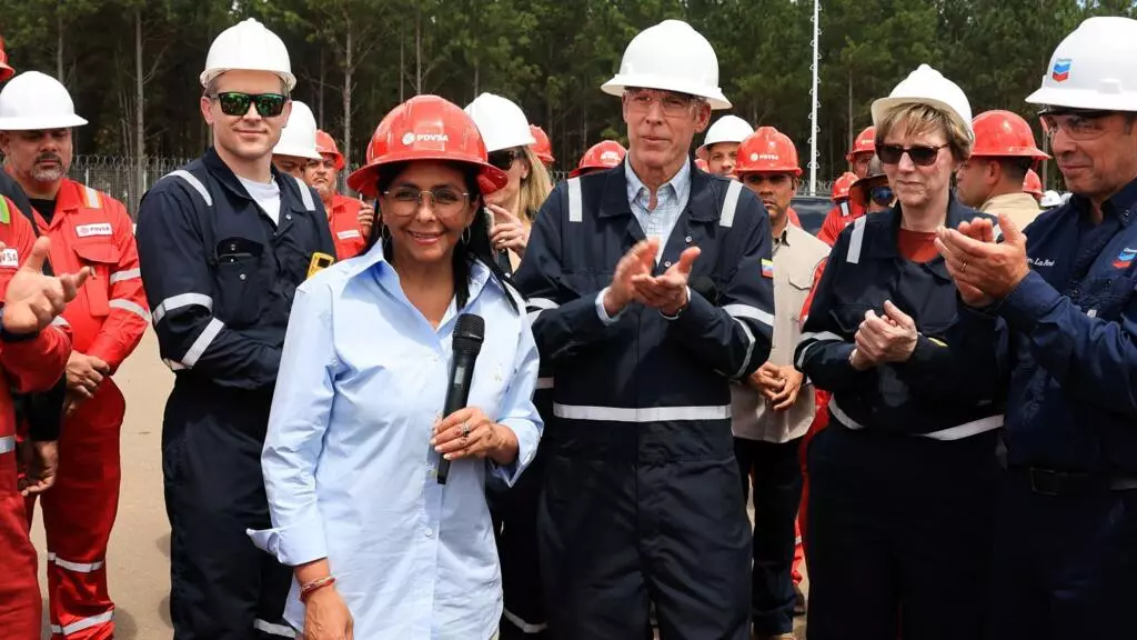 La presidenta interina de Venezuela, Delcy Rodríguez, el secretario de Energía de EE. UU., Chris Wright, y la encargada de negocios de EE. UU. para Venezuela, Laura Dogu, visitan las instalaciones de producción de petróleo en la empresa conjunta entre Chevron y la petrolera estatal PDVSA en la Faja Petrolífera del Orinoco, en el estado de Monagas, Venezuela, el 12 de febrero de 2026.