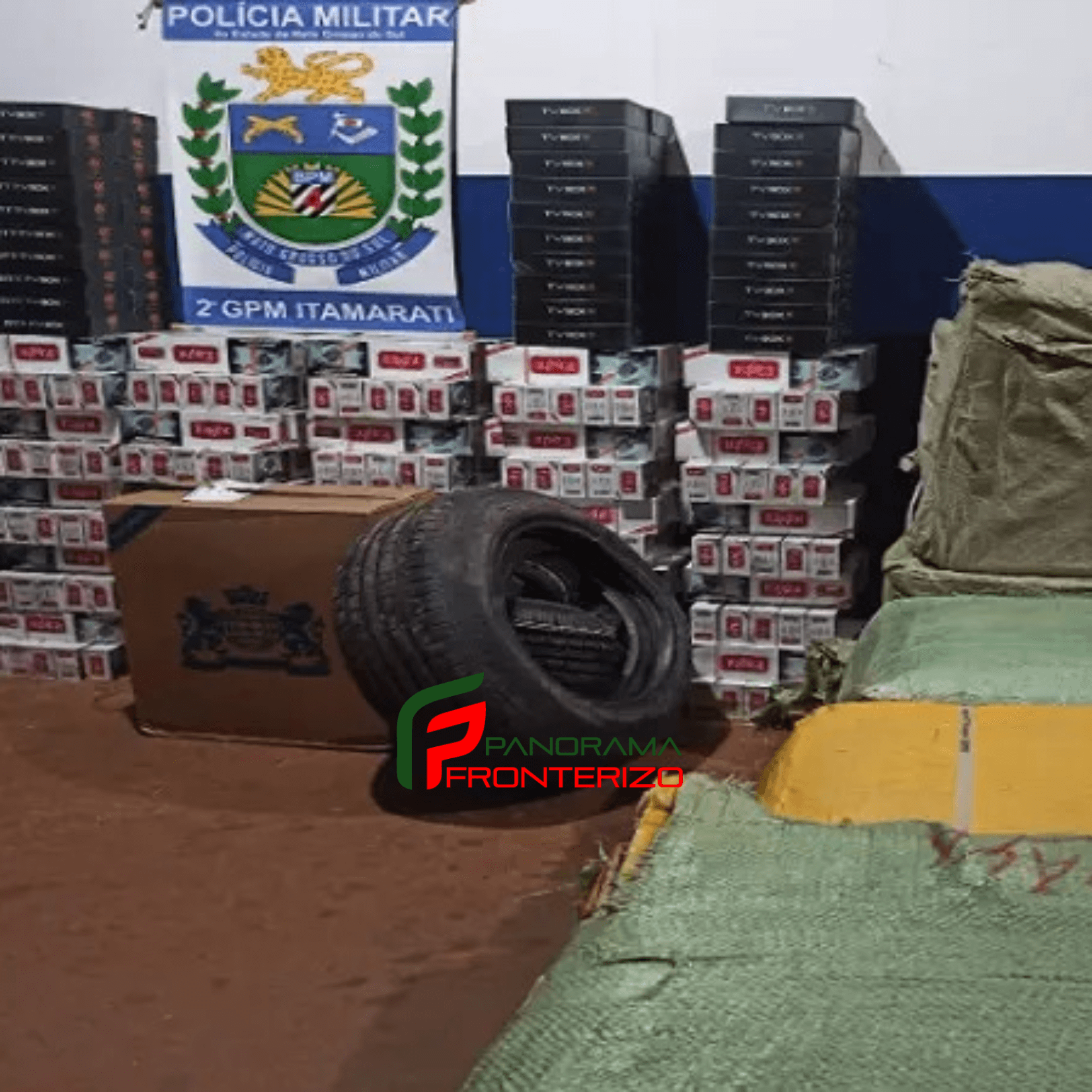 O veículo foi rebocado até o Grupamento Policial Militar para a contagem das mercadorias que resultou em: 05 pneus, 300 pacotes de cigarros (marcas FOX e Eight), 05 caixas de óculos e 100 aparelhos de TV Box (marcas MX9 e MX9PRO).
