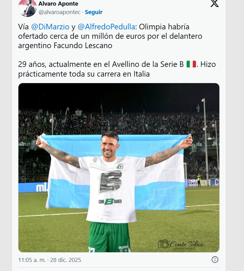 🙌 OLIMPIA AHORA BUSCA TRAER UN DELANTERO DE EUROPA: Ante la caída de Tomás Rodríguez, Olimpia va por un delantero que juega en Europa. Se trata del delantero argentino de 29 años, Facundo Lescano, quien a pesar de haber nacido en Argentina, toda su carrera la ha hecho en Europa y casi exclusivamente en Italia. En el 2025 vistió la camiseta del Avellino de la Serie B.