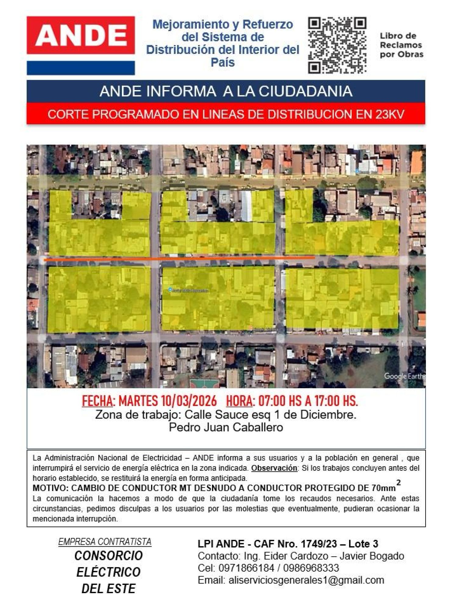 La Administración Nacional de Electricidad (ANDE) informa que se realizará una interrupción del servicio eléctrico este martes en un sector de Pedro Juan Caballero. Los trabajos de mejoramiento del sistema se extenderán desde la mañana hasta la tarde.