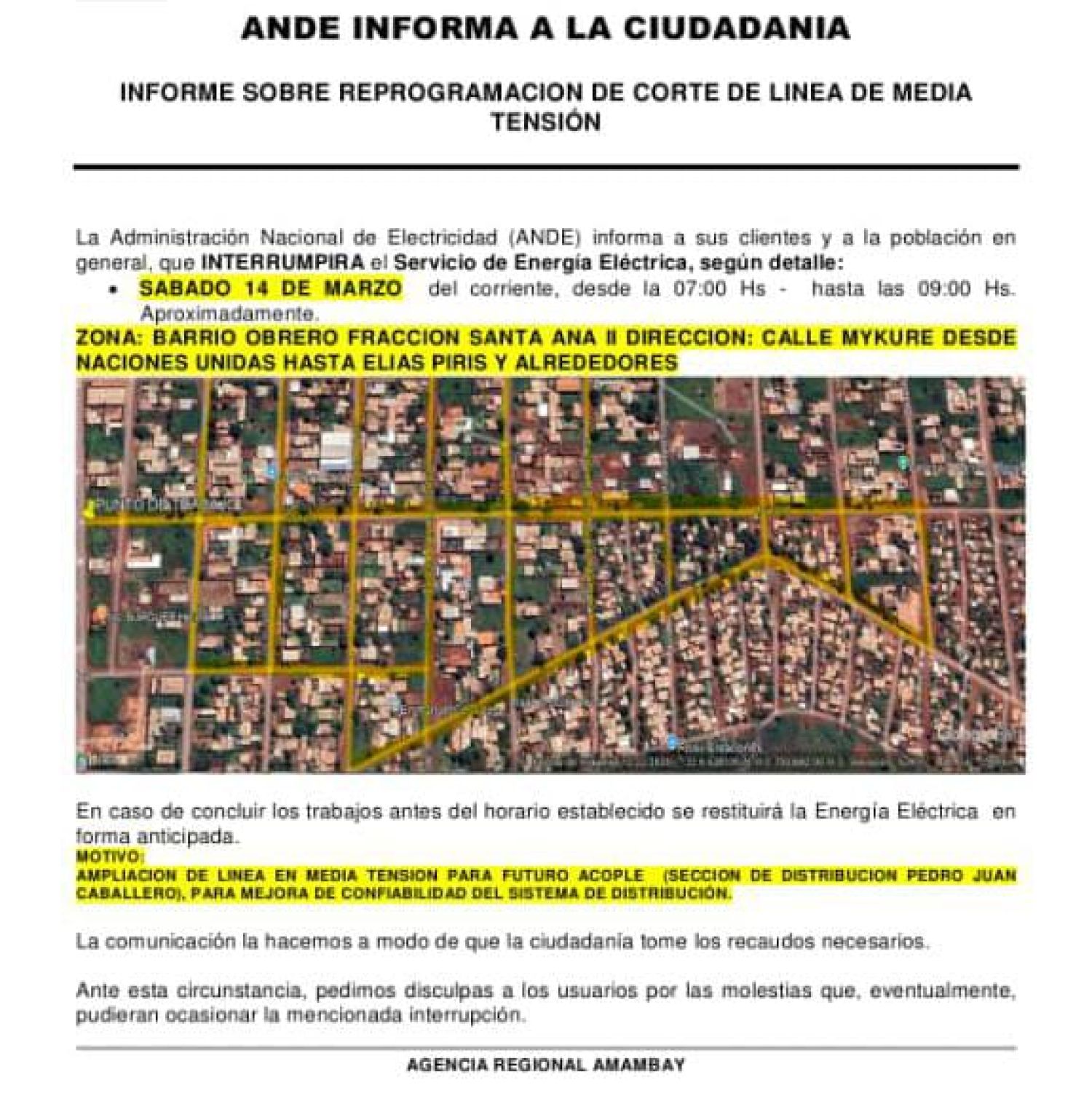 El área de trabajo comprende la calle Mykure, desde Naciones Unidas hasta Elías Piris y alrededores. Según el informe técnico emitido, el motivo de la interrupción es la ampliación de la línea para un futuro acople, con el objetivo de mejorar la confiabilidad del sistema de distribución en este sector de la ciudad.