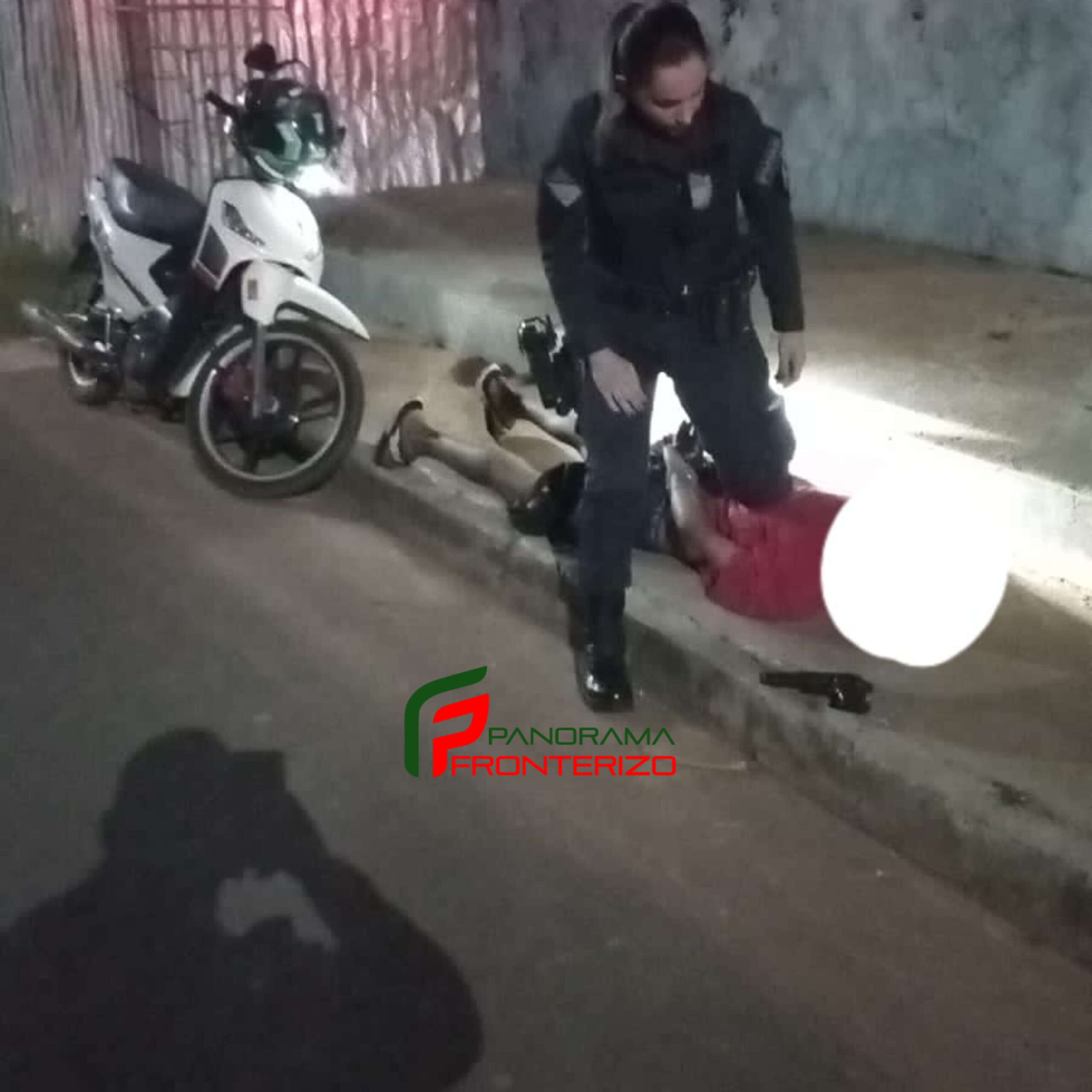 A guarnição seguiu na perseguição à motocicleta que poderia ser produto de roubo. Durante a abordagem, foi realizada uma busca pessoal no autor identificado como M.D.C.A., de 25 anos. Na cintura do suspeito foi encontrado um simulacro de arma de fogo, e ele prontamente confessou sua participação no crime.