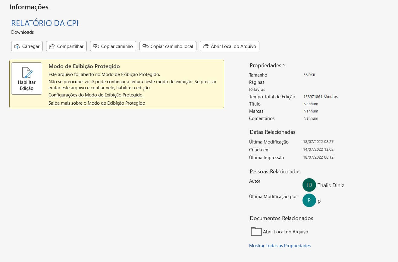 O arquivo, intitulado «RELATÓRIO DA CPI», possui propriedades que levantam sérias questões sobre a integridade da investigação. De acordo com o print dos metadados do documento, o relatório foi criado em 14 de julho de 2022 e modificado pela última vez em 18 de julho de 2022. Embora oficialmente tenha sido assinado pelo vereador Cemar Arnal (PP), relator da CPI, a autoria verdadeira aponta para o procurador Thalis Diniz, mencionado nos metadados como criador do arquivo. Essa revelação confirma que o texto, que deveria ter sido produzido de forma independente pelo legislativo, passou pelo controle direto de membros do executivo municipal.