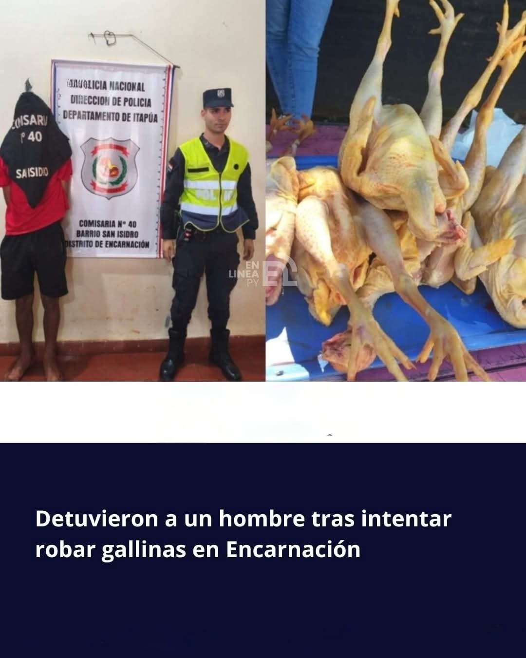 Un joven de 23 años identificado como José Luis Rojas Martínez fue aprehendido en el barrio San Isidro de Encarnación tras ser sorprendido presuntamente hurtando gallinas de un puesto de ventas.