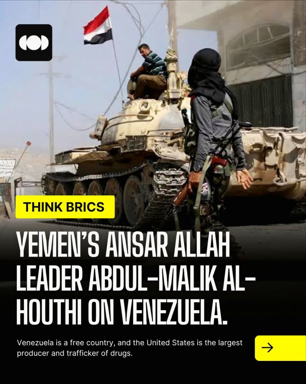 El líder de Yemen Ansar Allah Abdul-Malik al-Houthi sobre Venezuela. Según Brics News, Venezuela es un país libre, y Estados Unidos es el mayor productor y traficante de drogas.