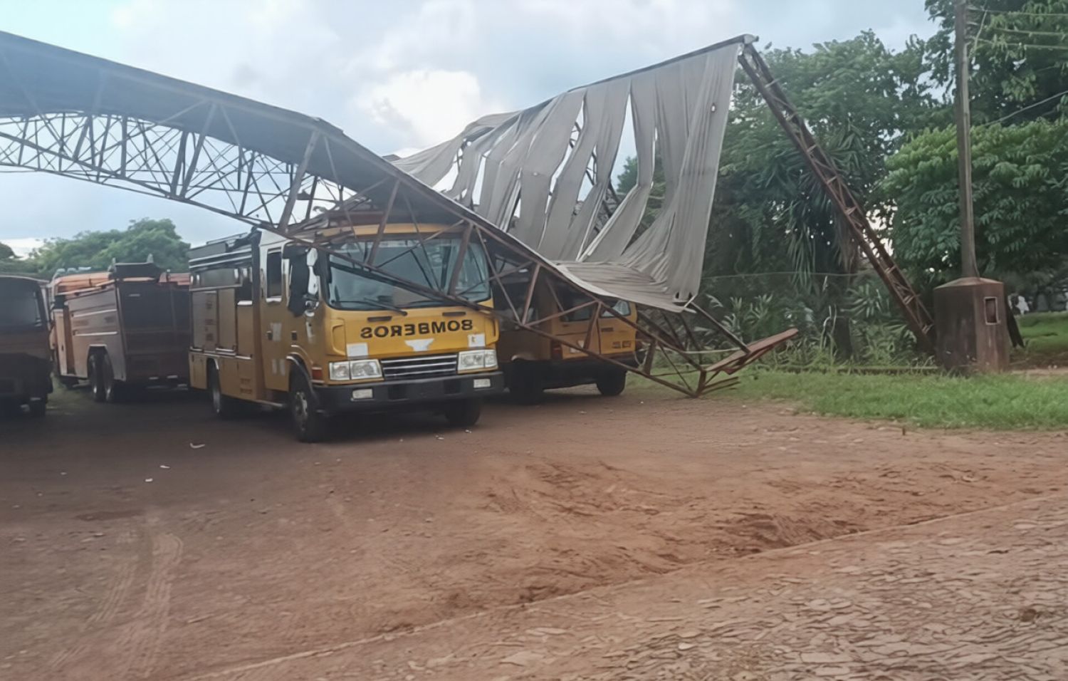 El cuartel del Cuerpo de Bomberos Voluntarios (amarillos) sufrió el colapso total de su tinglado tras un fuerte viento que afectó a Pedro Juan Caballero el pasado miércoles (18). El derrumbe dejó importantes daños materiales a la estructura metálica y a varios vehículos operativos de la compañía, por lo que la institución apela a la solidaridad ciudadana para iniciar la reconstrucción de su base de emergencias.